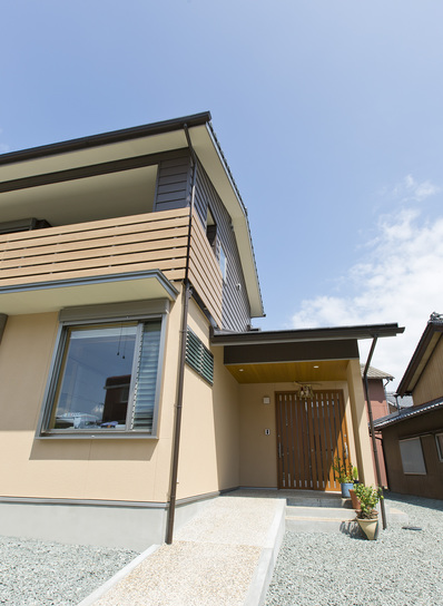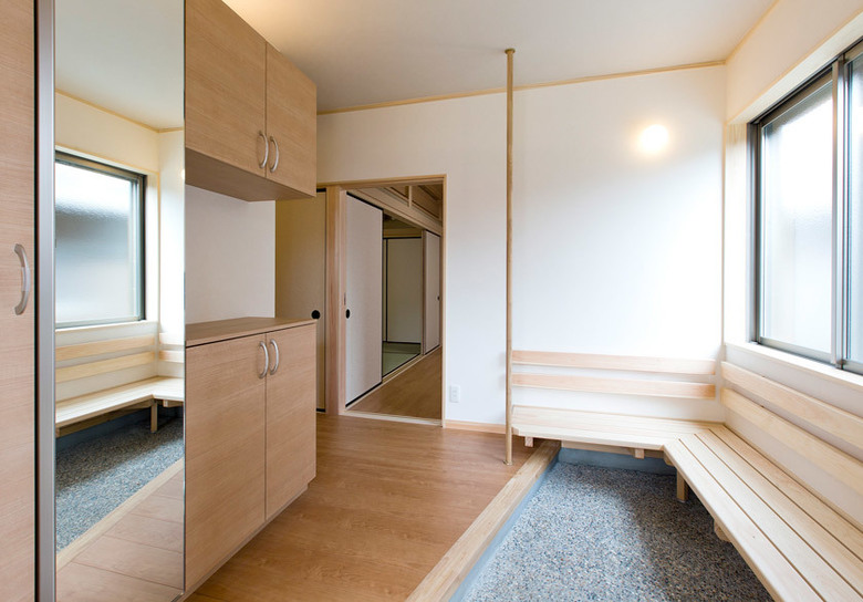 ちょっと広めの玄関には、立ち話ではなく、落ち着いて話ができるようにベンチを設けてあります。