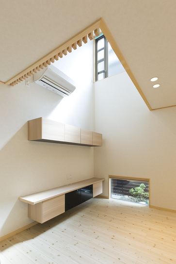 リビングには地窓を設置して坪庭を見れるように外との繋がりを設けて解放感を出しています。