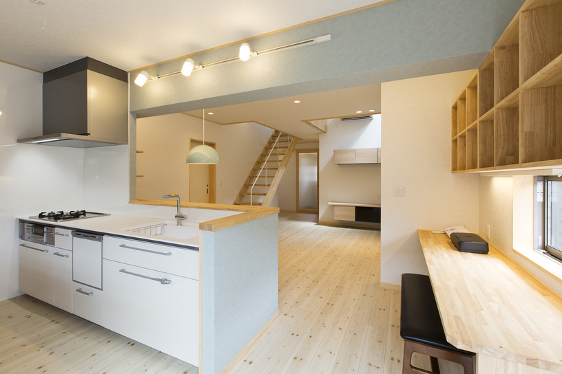 キッチンと家事室と洗面所をぐるりと設置、家事動線にも一工夫。