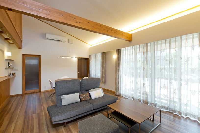 生活の中心となる広いリビングは、勾配天井を設け、間接照明で天井を照らし、照明がつけれる夜が待ちどうしくなるぐらい、素敵な雰囲気をもった空間です。